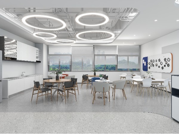 吊掛式燈管平衡了頂層的空間感,柔和的白色系更能讓辦公人士沉淀工作思路的清晰度,藍橙撞色的裝飾細節(jié)和清新的綠植避免了完全純白的單調(diào)性,使研發(fā)工作者保持頭腦的思維活性,更好地輸出創(chuàng)新靈感。