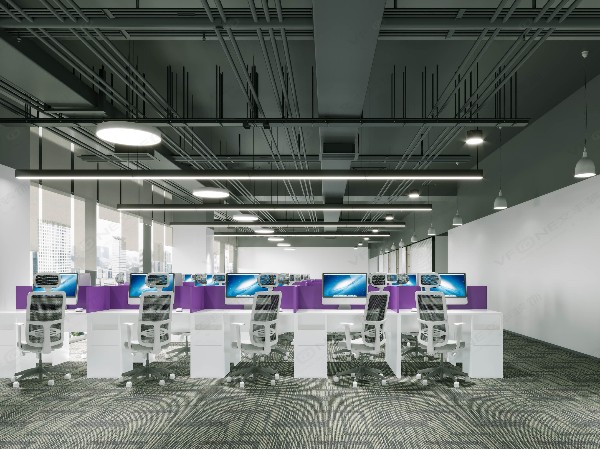 色調(diào)統(tǒng)一是辦公室裝修設(shè)計(jì)的基本原則,和諧的同類(lèi)色彩搭配,在色彩的使用上豐富色彩的深淺層次,才不會(huì)看上去單調(diào)乏味。整體配色選用高級(jí)灰,淡雅高級(jí),能使員工沉浸在專(zhuān)注平靜的工作狀態(tài),提高員工的辦公效率。局部高飽和的紫色能增強(qiáng)空間的活力,讓創(chuàng)意型職能人員思維更加發(fā)散,保證工作模式的綜合性。