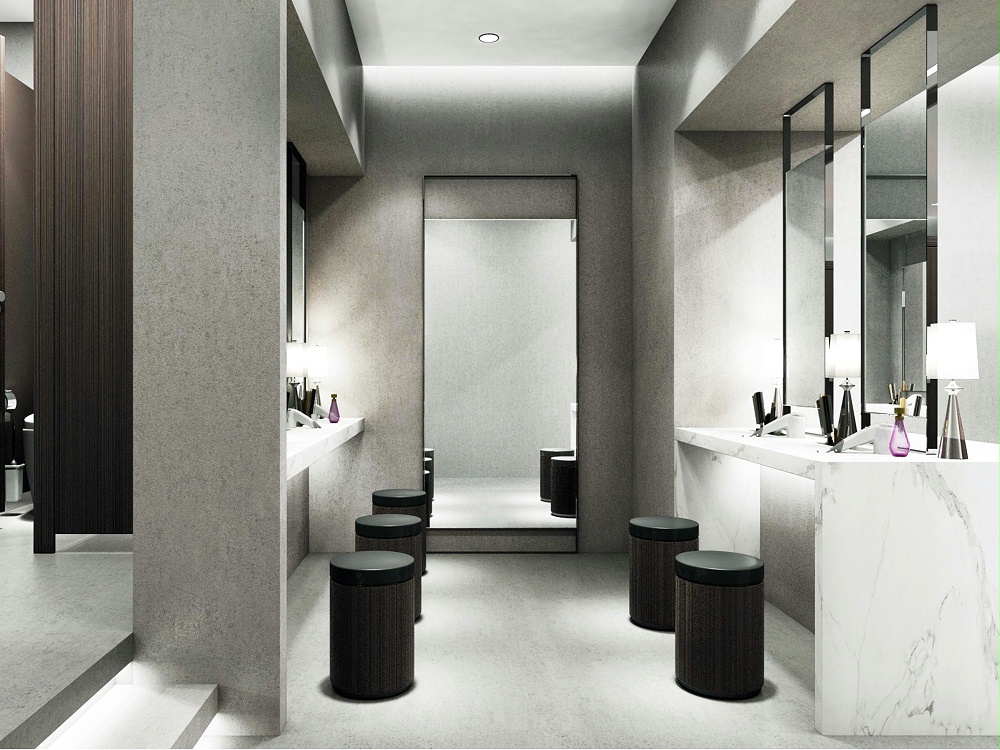 洗手間設(shè)計風(fēng)格定位于簡約時尚,以灰白色為主基調(diào),黑色為輔,在時尚的思想中多了點含蓄,還讓整個空間有著很強烈的層次感。