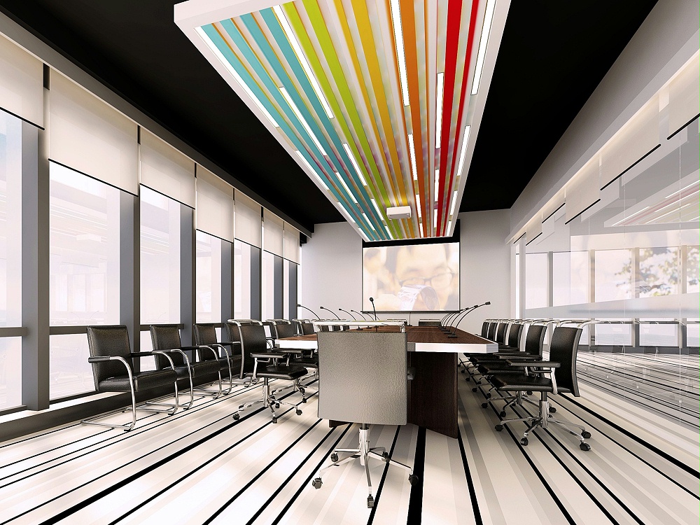 深圳科技公司裝修效果圖       會(huì)議室以跳躍的色彩和線條作為天花的設(shè)計(jì),天花和地面的線條呼應(yīng),延展了空間在寬度和高度的視覺感受。像時(shí)空的隧道,增加了這個(gè)空間的科技感,和這個(gè)科技企業(yè)的屬性相吻合。