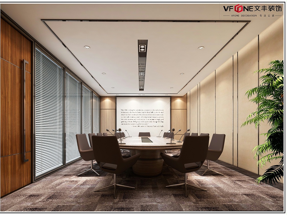 本案會(huì)議室裝修設(shè)計(jì)上以原木色為主調(diào),通過(guò)色彩明暗深淺豐富視覺(jué)層次感;硬裝與軟裝的色調(diào)上的統(tǒng)一性不僅帶來(lái)視覺(jué)上的美感,還彰顯著企業(yè)的嚴(yán)謹(jǐn)性。以大量簡(jiǎn)潔的豐富造型使空間更加具有形式感,而且同時(shí)還不會(huì)顯得瑣碎雜亂,不僅使空間更加具有現(xiàn)代氣息,而且所展現(xiàn)的穩(wěn)重還不會(huì)有失現(xiàn)代感。