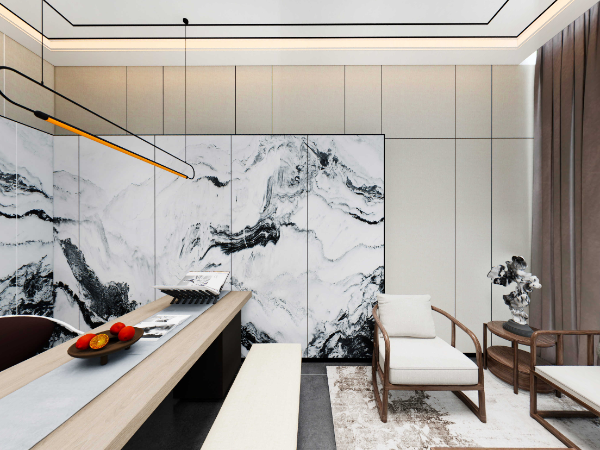 空間以新中式的裝修風(fēng)格為基調(diào),精致的流水山石盆景,