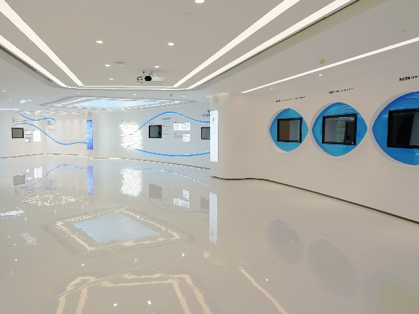 前廳空間以大面積的白色作為空間的主色調(diào),充分展示了Winkey作為化妝品功效原料研發(fā)、生產(chǎn)和應(yīng)用企業(yè)的潔凈屬性。同時,在立體空間中將線條運(yùn)用在前臺、背景墻、地磚和天花燈的設(shè)計當(dāng)中,結(jié)合白色空間的主色調(diào),讓人不由自主地聯(lián)想到絲滑通透的面霜質(zhì)地,完全符合企業(yè)調(diào)性。