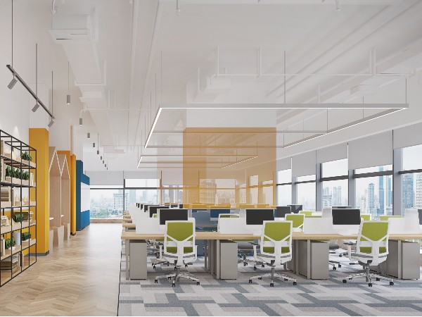 設(shè)計(jì)師在設(shè)計(jì)思維巡航的辦公區(qū)域是大有來(lái)頭,從辦公區(qū)一共只能看到三種顏色,黃,藍(lán),綠,在顏色的搭配中更加具有創(chuàng)意感,大大提升了員工在辦公時(shí)的精氣神,且做上方用圓筒射燈,線條感分明