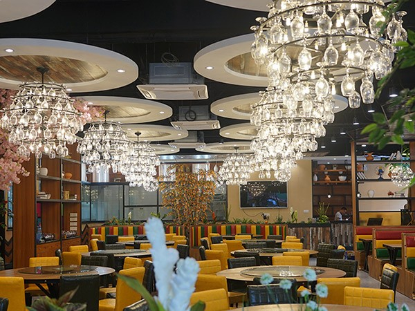 用餐區(qū)中天花懸掛一個(gè)個(gè)用酒杯組合構(gòu)成的吊燈,心路玲瓏格調(diào)高,將餐廳打造出熱情洋溢的氛圍,明亮通透,火辣熱情。湖南人反抗堅(jiān)忍、敢做敢當(dāng)、忍耐刻苦、驍勇強(qiáng)悍的氣質(zhì),常被人稱(chēng)為“騾子”、“蠻子”,這種人文特征與辣椒的精神內(nèi)質(zhì)相通,因而辣椒與“辣人”一拍即合。