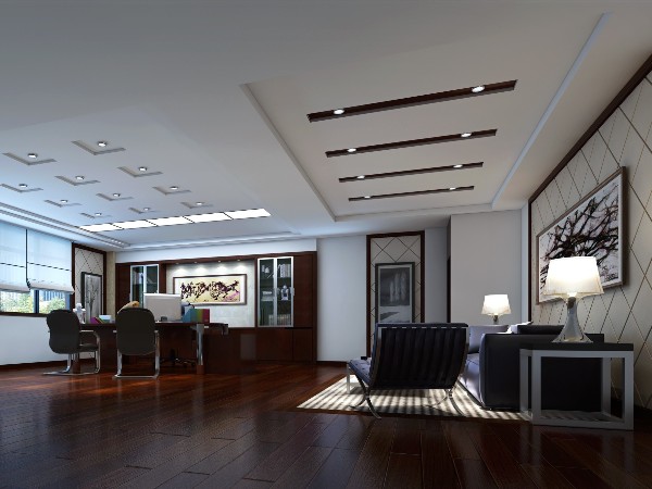 暗紅色的木質(zhì)地板、白色軟裝的背景墻與天花、黑色沙發(fā)三種高飽和度的顏色搭配,高度還原了董事長辦公室本應(yīng)有的神秘與高貴。天花板上整齊排列的小壁燈,小而精致,既不刺眼,也為這個空間增加了質(zhì)感。 廠房辦公室裝修
